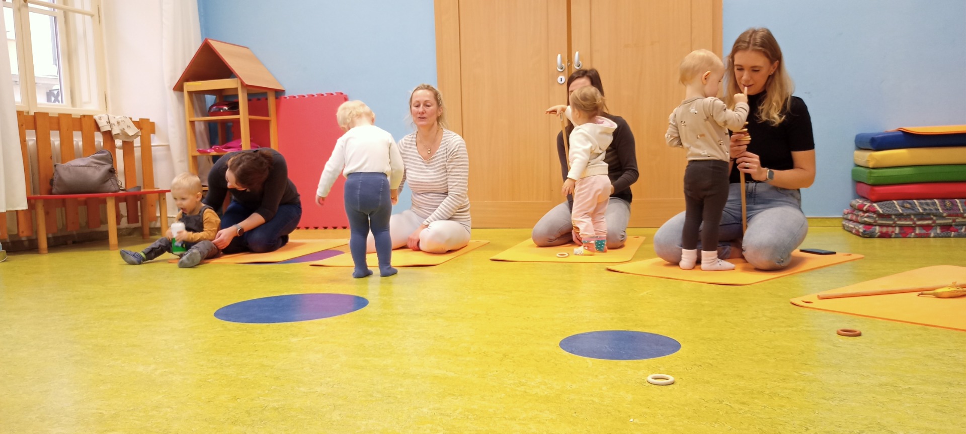 Do cvičení se mohou přirozeně zapojit i maminky, což dětem dodává pocit jistoty a bezpečí.